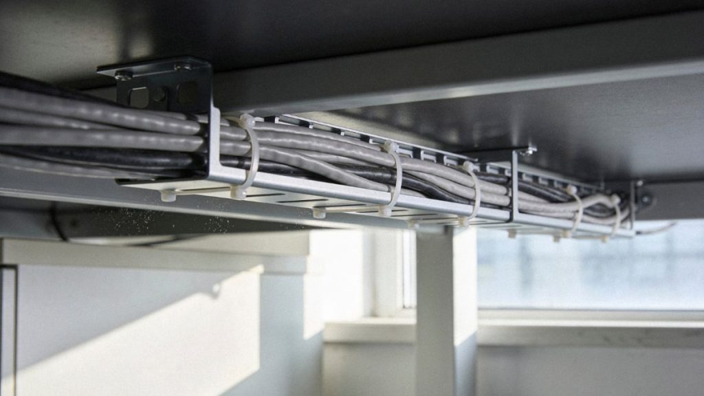An under desk cable tray acts as a basket to hold power strips and excess wiring. This organizer keeps the floor area clear for feet and makes vacuuming underneath the desk easier. Keeping cords off the ground prevents tangles and protects cables from accidental damage. It creates a visually streamlined look by hiding the chaotic web of wires typically found behind computers.