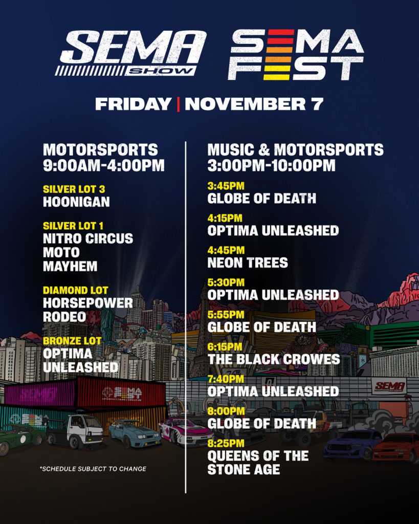 “The 2025 SEMA Fest is officially set to deliver an unforgettable blend of music, motorsports and car culture in just over one month in Las Vegas. Beginning Friday, November 7, at 9:00 a.m. PT, fans will experience heart-pounding drifting and tire-burning performance activations across the Las Vegas Convention Center campus, including Hoonigan (Silver Lot 3), Nitro Circus Moto Mayhem (Silver Lot 1), HorsePower Rodeo (Diamond Lot) and OPTIMA Unleashed (Bronze Lot).